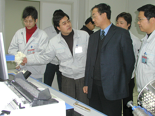 通過(guò)參觀和了解,徐文英會(huì)長(zhǎng)深有感觸地說(shuō):長(zhǎng)嶺紡電早就聞其名,但是百聞不如一見(jiàn),今天看到長(zhǎng)嶺紡電較強(qiáng)的科研開(kāi)發(fā)實(shí)力、先進(jìn)的生產(chǎn)設(shè)備、嚴(yán)格的質(zhì)量管理體系令人欣慰,而這正是確保長(zhǎng)嶺紡電在行業(yè)領(lǐng)先地位的關(guān)鍵所在。在參觀中,徐文英會(huì)長(zhǎng)對(duì)長(zhǎng)嶺紡電研發(fā)的XJ120快速棉纖維性能測(cè)試儀進(jìn)行詳細(xì)了解,認(rèn)為該產(chǎn)品打破國(guó)際市場(chǎng)壟斷,填補(bǔ)國(guó)內(nèi)空白,更貼近國(guó)內(nèi)棉花的測(cè)試和用戶的需求。他說(shuō),棉紡織協(xié)會(huì)將堅(jiān)持“為企業(yè)服務(wù)的宗旨”,利用棉紡織行業(yè)形勢(shì)分析會(huì)、研討會(huì)等推廣長(zhǎng)嶺紡電品牌、宣傳長(zhǎng)嶺紡電產(chǎn)品,尤其是著重推廣打破國(guó)外壟斷的棉纖維檢測(cè)儀,更大范圍地滿足專業(yè)檢測(cè)機(jī)構(gòu)和紡織企業(yè)的需要。