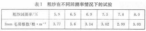 精紗回潮率在生產過程中牽伸纖維與纖維、纖維與機械表面之間相互磨擦容易引起纖維產生靜電,當纖維間帶有相同電荷時,由于同性電荷的相互排斥造成纖維之間互不抱合,從而引起紗條內的纖維端因為靜電而外露,增加紗線毛羽。從物理學的角度我們知道纖維的比電阻與纖維的回潮率成負相關,而纖維的回潮率與其相對濕度成正相關,即生產環(huán)境相對濕度大,纖維的回潮率大,其比電阻相對則偏小。因此,我們可通過提高生產環(huán)境的相對濕度來增加纖維的回潮率,從而降低纖維的比電阻,增加纖維在生產過程中產生的靜電荷的散逸速度,這樣可以從很大程度上消除纖維上的靜電,通過減小纖維間因靜電原因的相互排斥而頭尾外露,以達到降低毛羽的目的。表1是粗紗在不同回潮率情況下的試驗對比。