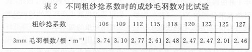 粗紗捻系數的大小對成紗的毛羽有一定程度的影響。粗紗捻系數偏小,粗紗在卷繞成形及運輸過程中易出現發(fā)毛、表面不光潔,這樣顯露在粗紗表面的纖維越多則在細紗生產過程中產生毛羽的機率相對就越多。適當增加粗紗捻系數,同時減小其后區(qū)牽伸倍數,可以降低后牽伸區(qū)纖維的擴散程度,加強紗條內纖維之間的抱合力,讓纖維須條在進入主牽伸區(qū)時留有一定的捻回,使粗紗表面光潔,對減少成紗毛羽有利。表2是不同粗紗捻系數時的成紗毛羽數對比試驗。
