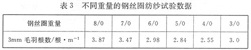 在環(huán)錠紡紗過程中,鋼絲圈重量的配置將直接影響到紡紗張力的變化,而紡紗張力是影響成紗毛羽的重要因素。因為在整個卷繞成型過程中,紗線的卷繞張力時刻在發(fā)生不同的變化。 鋼絲圈重量的大小影響紗線張力的變化。如果配置的鋼絲圈重量越輕,紗線張力就會越小,導致氣圈形狀過大,當管紗在底部時造成氣圈碰撞隔紗板,使紗線毛羽增加;同時由于紡紗三角區(qū)的纖維捻系數收縮相對較差,會影響纖維的有效加捻和抱合,從而也會使紗線毛羽增加。反之,如果配置的鋼絲圈重量越重,紗線張力就會越大,氣圈形狀則越小,當管紗在底部時造成氣圈碰撞紗管頂部而造成紗線毛羽過多。同時由于鋼絲圈重量重而出現磨滅早、使用周期短的現象。所以在選擇鋼絲圈重量時應慎重考慮,應通過試驗紡紗來選擇最佳重量的鋼絲圈。表3是使用6903型號的鋼絲圈在不同重量時的紡紗試驗數據。