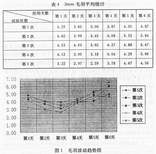 國內鋼絲圈的使用期限一般5~7天,但具體使用期限還要根據各企業(yè)的實際情況而定。我公司在J14.6tex品種上選用的國產鍍氟鋼絲圈使用期限最多不超過5天。在剛上機后,成紗毛羽一般偏長,在經過一個成熟期(大約是一排紗)后,成紗毛羽得到改善,在第2~3天毛羽較為穩(wěn)定,第4天毛羽有開始惡化的趨勢,第5天毛羽明顯增加,此時就必須更換鋼絲圈。表4和圖1分別是鋼絲圈使用天數與3mm毛羽平均統(tǒng)計值相對應的毛羽波動趨勢圖。