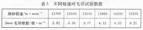細紗錠速對紗線毛羽有較大的影響,從表4試驗數據看出毛羽隨細紗錠速的增大而大幅度的上升。所以在實際生產過程中應合理選擇細紗錠速,不要一味追求產量而忽視產品質量,作為企業(yè)應權衡產量和質量的矛盾。表5是不同錠速時細紗毛羽測試數據。