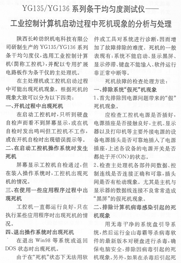 YG135/YG136系列條干均勻度測試儀——工業(yè)控制計算機啟動過程中死機現(xiàn)象的分析與處理
