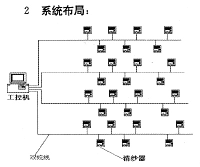 電子清紗器計算機網(wǎng)絡系統(tǒng)以一臺工控機作為上位機,利用數(shù)字式電子清紗器電控箱中預留的通訊接口組成車間數(shù)據(jù)管理中心。完成分析各絡筒機臺工作狀況,編輯打印產(chǎn)量或質(zhì)量報表,修改工藝參數(shù)等工作。實現(xiàn)生產(chǎn)車間全范圍內(nèi)清紗質(zhì)量、產(chǎn)量以及絡筒設備的監(jiān)控管理。