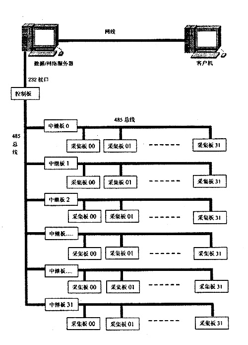 下位機(jī)為控制板、中繼板和采集板。采用兩級485總線采集數(shù)據(jù)和232接口與計算機(jī)通訊組成,如系統(tǒng)框圖所示。控制板主要完成數(shù)據(jù)上報和數(shù)據(jù)查詢,中繼板主要對接收到的控制板數(shù)據(jù)進(jìn)行解釋、說明和選擇傳送以及將采集板上傳的數(shù)據(jù)轉(zhuǎn)發(fā)給控制板,采集板根據(jù)接收的數(shù)據(jù)和自己的狀態(tài)發(fā)送不同的數(shù)據(jù)。
