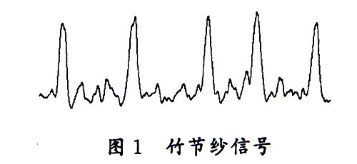 竹節(jié)紗用于在織物中添加特殊的效果,這一效果的添加通常比較隨意,決定了竹節(jié)紗的多樣性和富于變化性,對竹節(jié)紗進(jìn)行質(zhì)量控制需要從比較隨意的設(shè)計中找到規(guī)律,對生產(chǎn)的竹節(jié)紗進(jìn)行質(zhì)量判定。竹節(jié)紗中竹節(jié)的長度和幅度是否在設(shè)定的范圍內(nèi)、竹節(jié)間距的分布是否符合要求、竹節(jié)紗中有無影響整個布面效果的因素都是竹節(jié)紗質(zhì)量控制的關(guān)鍵。將竹節(jié)紗在 條干儀上進(jìn)行測試,得到了竹節(jié)紗通過電容式檢測頭時所感應(yīng)出來的信號(圖1),可以看到,信號上存在很多突起,從整個紗線信號中檢出竹節(jié)部分,統(tǒng)計竹節(jié)和竹節(jié)間距,計算用于評價竹節(jié)紗質(zhì)量的各項性能指標(biāo),判斷竹節(jié)紗是否在設(shè)定的范圍內(nèi),是建立竹節(jié)紗質(zhì)量控制模型的基本思路。