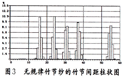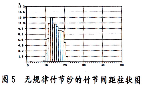 將所測試的圖形和指標(biāo)與該竹節(jié)紗的工藝參數(shù)相比較,發(fā)現(xiàn)竹節(jié)長度、竹節(jié)間距、竹節(jié)密度、倍數(shù)、基紗號數(shù)、竹節(jié)號數(shù)等測試指標(biāo)與設(shè)定的工藝參數(shù)基本吻合,在散點圖上,絕大部分散點位于竹節(jié)長度6.3cm、倍數(shù)197%為中心的區(qū)域內(nèi),只有極少數(shù)散點脫離了這一區(qū)域,在竹節(jié)間距柱狀圖上,16cm、24cm、31cm、38cm、56cm的附近區(qū)域上均有較大的柱狀圖形, 其他位置基本上沒有柱狀圖,說明所測試的竹節(jié)紗的質(zhì)量符合設(shè)計要求。