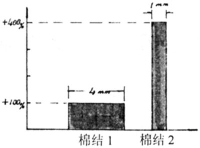 對(duì)棉結(jié)的另一解釋是,比較兩個(gè)具有理想尺寸的棉結(jié)以1mm作為參考長(zhǎng)度,即靈敏度水平設(shè)定為+400%(相對(duì)1mm長(zhǎng)度而言)對(duì)長(zhǎng)度為4mm而截面超出紗線平均截面的200%(相應(yīng)靈敏度水平為+100%),兩種棉結(jié)是等價(jià)的同樣給予計(jì)數(shù)。參看圖1,具有理想尺寸的棉結(jié)1與棉結(jié)2等價(jià),即當(dāng)棉結(jié)靈敏度水平設(shè)定為+400%時(shí),兩種棉結(jié)同樣給予計(jì)數(shù)。計(jì)為棉結(jié)的長(zhǎng)度應(yīng)短于4mm。