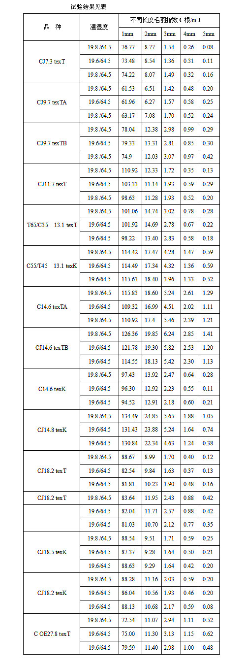 3.3 結(jié)論:從表1可以看出,應(yīng)用YG172毛羽測試儀對各種線密度、不同用途、不同纖維混紡、不同紡紗形式的紗線所做的毛羽檢驗,在多次試驗條件下,其檢驗結(jié)果具有很高的一致性,其中每個品種的毛羽數(shù)量或有不等,緣于其紡紗纖維、設(shè)備、管理等因素的離散性,特別是一個品種中纖維品質(zhì)的差異,及不同品種的捻度不勻,導(dǎo)致不同長度毛羽數(shù)量分布的離散性,而非檢驗儀器本身造成。
