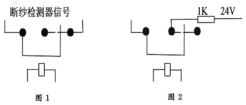 精銳30B的工作原理及其使用與精銳30相同。清紗原理都是采用電容式、絕對測量原理、嵌入式處理技術(shù)設計而成的。廣泛用于轉(zhuǎn)杯紡紗機上,主要功能是清除紗線上有害紗疵。采用16錠1組的處理模式,具有材料系數(shù)自動調(diào)整功能,可以按左、右車設定材料系數(shù)、紗號;可完成棉結(jié)、短粗節(jié)、長粗節(jié)、細節(jié)四種紗疵的清除(30B具有清除竹節(jié)紗疵功能);可進行全程錯支檢測、數(shù)據(jù)統(tǒng)計、定長、在線自檢和故障報警;也可進行聯(lián)網(wǎng)。整個裝置由二級87C196KD微處理器構(gòu)成,具有16位數(shù)據(jù)總線和10位A/D,運行速度快、A/D轉(zhuǎn)換精度高。上位機由電控箱內(nèi)的控制器組成,下位機由10至20個處理器中的單片機組成,構(gòu)成一個主從式二級微處理器系統(tǒng)。上位機主要完成機組、紗線品種、清紗門限、定長、班次等數(shù)據(jù)的設定,數(shù)據(jù)統(tǒng)計,自檢和故障報警等功能。下位機主要完成多路數(shù)據(jù)采集,程控增益放大,各種紗疵判斷,發(fā)出紗疵清除信號,同時與控制器通訊,完成各種數(shù)據(jù)傳送。精銳30的斷紗原理是由于受到安裝位置的限制,精銳30的檢測頭不帶切刀,如果發(fā)現(xiàn)需要清除的紗疵就需要和主機結(jié)合進行斷紗。精銳30通過繼電器和主機結(jié)合,清紗器控制繼電器動作,繼電器的兩個觸點和主機的斷紗檢測器的信號線相連接。目前清紗器要求主機斷紗有兩種情況:一種是繼電器的常閉端、公共端和斷紗檢測器的信號線相連(也就是說把斷紗檢測器的信號線截斷,將繼電器的常閉端、公共端串入),如圖1,如發(fā)現(xiàn)需要斷紗,控制繼電器動作,常閉端斷開,斷紗檢測器信號中斷,主機停止喂棉形成斷紗,泰坦、蘇拉、精工機器屬于此類(電纜7#、8#是此接法);另一種是通過繼電器的常開端、公共端將主機的24V電源經(jīng)過1K電阻并到斷紗檢測器上,不需要斷紗時,繼電器在常閉端上(常閉端為懸空),需要斷紗時,繼電器動作,24V電源通過繼電器加到主機控制板上,主機停止喂棉形成斷紗,日發(fā)公司的RFRS10/30屬于此類(電纜5#、6#、8#、9#是此接法),如圖2。