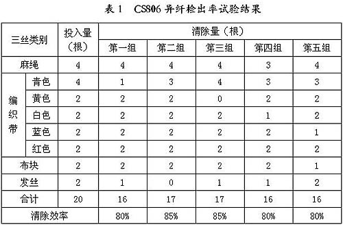 通過這些措施和方法,長嶺紡電CS系列產(chǎn)品的清除效率得到了很大的提升。表1是產(chǎn)品改進(jìn)后用戶的實驗數(shù)據(jù)。在棉花充分開松的條件下,采用最小尺寸面狀為1cm2、線狀為40mm×2mm的各種異纖混合后,從前級開棉機(jī)出口投入棉流,進(jìn)行檢出率試驗,試驗結(jié)果如表1所示。