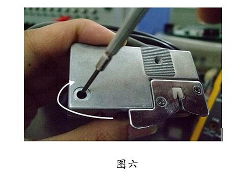 如圖六所示,調(diào)整孔中的靈敏度調(diào)整電位器大小可以使檢測頭的靈敏度增大或者減小。順時針旋轉(zhuǎn)靈敏度調(diào)整電位器使靈敏度增大,逆時針旋轉(zhuǎn)靈敏度調(diào)整電位器使靈敏度減小。假若這錠檢測頭是40mV,相差了20%,需要將靈敏度提高5~15mV。可順時針旋轉(zhuǎn)靈敏度調(diào)整電位器,調(diào)整電位器后讀一下檢測頭零點在投絲前后的變化量(即靈敏度),若不在滿足范圍內(nèi)的話,就繼續(xù)調(diào)整電位器,直到該錠檢測頭的靈敏度與標準值相差在10%之內(nèi)。