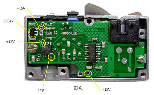 如果檢測頭的零點超過±5V范圍,就要檢查電源是否正常,檢測頭中有4路電源,分別為±15V、±12V,電源的位置如圖九所示。