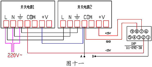首先準備兩塊15V的開關電源及一些導線,以及圖一中的D型9針插座,型號為111-092-30,按下圖(圖十一)所示的方法接線。在圖十一中,開關電源1提供-15V,開關電源2提供+15V,開關電源上的標識“L”、“N”、“ ”表示該點接入交流220V的火線、零線和地線;“COM”表示開關電源輸出直流電壓的地線,“+V”表示開關電源輸出的直流電壓。在接線時,將2個開關電源的“L”、“N”、“ ”分別對應連接,并將其中一只開關電源的“L”、“N”、“ ”接入交流220V電源;將開關電源1的“+V”與開關電源2的“COM”連接,這時開關電源1的“COM”即輸出-15V電壓,開關電源2的“+V”輸出+15V電壓,“COM”為±15 V電源的地線。將開關電源1的“COM”接入D型9點插座的2腳,開關電源2的“+V”接入插座的7腳,開關電源2的“COM”接入插座的8腳,這時這個簡易的S30檢測頭檢查、維修裝置就制作完成了。D型9點插座的1腳為檢測頭的零點輸出,我們可以在插座的1腳上焊出來一根導線方便使用三用表測試,在圖十一中將檢測頭接插在插座“1XP”上,“A”點接三用表的黑表筆,“B”點接紅表筆,即可測得檢測頭的零點,繼而可對檢測頭進行零點、靈敏度和清零按鈕等項目的檢查。