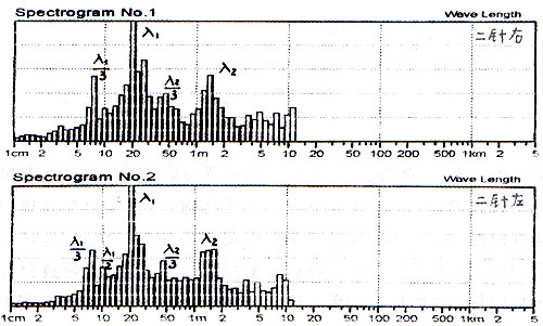 從不勻曲線圖中亦可看出在約67小格范圍內(nèi)出現(xiàn)規(guī)律性波動(dòng)10次,即λ2(曲線)≈67×12.5÷﹙10-1﹚≈ 93cm。