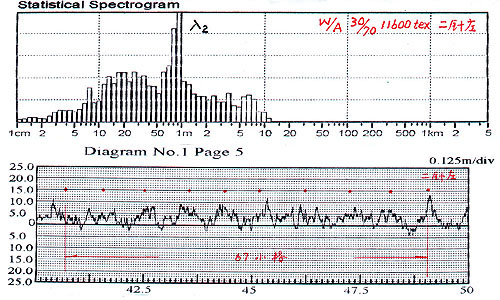 繼續(xù)降低二針車速(出條速度降為24米/分)并減小牽伸倍數(shù)(由7.2減為4.4倍),減輕牽伸負(fù)荷并進(jìn)一步使設(shè)備運(yùn)轉(zhuǎn)平穩(wěn)。由于來(lái)自頭針的毛條號(hào)數(shù)不變,此時(shí)二針的輸出毛條變粗約為11600tex。測(cè)得二針毛條波譜圖(50米/分,2分鐘)及不勻曲線圖見圖2。