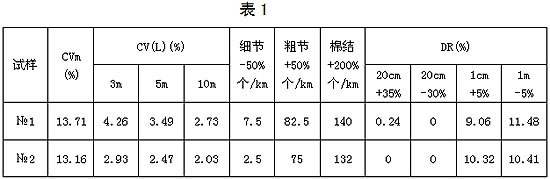 取半精梳CJ/C18.5tex管紗做基紗串接兩段半精梳CJ/C22.7tex細紗構成長約5.5m粗約+23%的兩個異常粗節(jié)進行模擬試驗?!?為串接兩異常粗節(jié)的試樣,№2為同一管紗的正常試樣,兩試樣長度皆為400m。測得有關數(shù)據(jù)見表1,№.1試樣的線密度不勻曲線及№1、№2兩試樣的DR曲線見圖1。