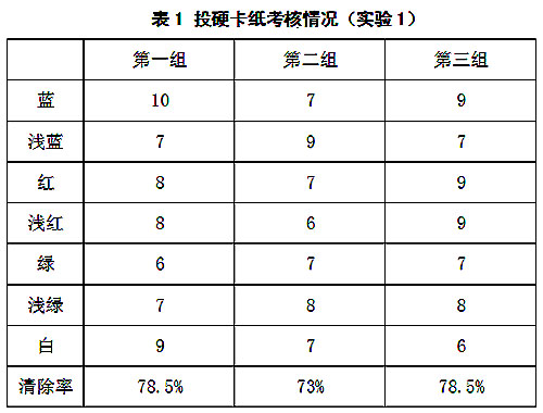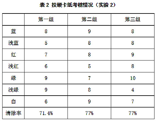 CS808棉花異纖清除機目前在某廠家做實驗使用5個多月,現(xiàn)場產(chǎn)線為圓盤機 ,開松效果不如清梳聯(lián),并且每天檢測的棉花品種都不同,且差異較大,因此根據(jù)現(xiàn)場情況創(chuàng)建多個分類器,不同的分類器設(shè)置不同的算法參數(shù),滿足配棉頻繁變化的需求。投擲樣本為硬卡紙,長度為 40mm×2.0mm的七種紙條(紅、綠、藍、淺紅、淺綠、淺藍、白色熒光)混合后,在距離檢測通道前正中間開一個8mm小孔,在棉花通過檢測區(qū)域時,在該小孔投放樣本,投放完畢后從廢棉中檢出投放樣本,試驗結(jié)果如表1和表2所示。