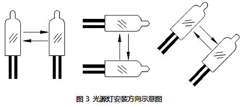 光源安裝座安裝時應(yīng)注意兩光源方向一致。所謂方向一致,即不論光源豎裝、橫裝或斜裝,光源燈所指方向應(yīng)一致,如下圖3。