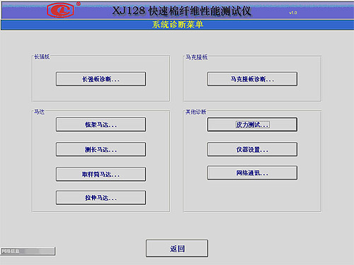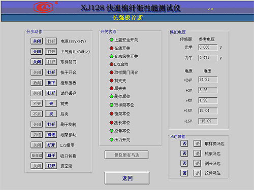 在XJ128正常待機(jī)的情況下,進(jìn)入“XJ128快速棉纖維測試儀”執(zhí)行軟件,在主菜單上點擊“系統(tǒng)診斷”按鈕,可進(jìn)入系統(tǒng)診斷菜單界面;點擊“長強(qiáng)板診斷…”按鈕,即可進(jìn)入長強(qiáng)板診斷界面。