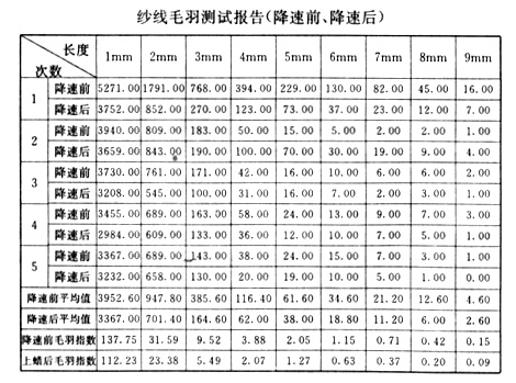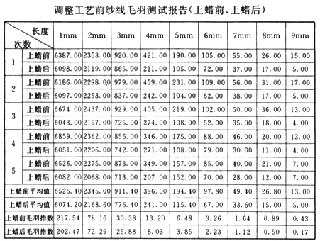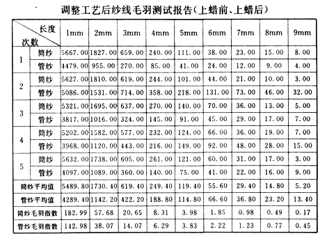 通過以上數(shù)據(jù)對比不難看出上蠟后毛羽數(shù)量少于上蠟前,降速后毛羽數(shù)量少于降速前,這樣我們就可以在實(shí)際生產(chǎn)中根據(jù)客戶對毛羽指標(biāo)的不同要求來適當(dāng)調(diào)整工藝。
