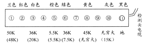 5 對于微處理器明顯燒壞的故障,換新板時,需對控制范圍內(nèi)的檢測頭逐個作電阻檢查,找出短路的檢測頭是否會再次燒壞新的處理器??稍谌f用表電阻擋用紅表筆或黑表筆接地,檢測正常電阻數(shù)據(jù)(如圖,括號內(nèi)數(shù)據(jù)為紅表筆接地)。